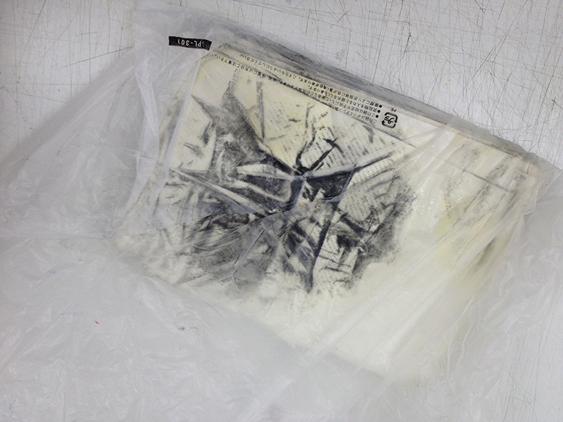 PS.コラグラフ実習の準備をしていて、道具箱を開けたら不思議なものが出てきました。面白い作品だな〜と思ったら、なんとかびた画用紙。ある意味、自然の美でもありますね。(汗)