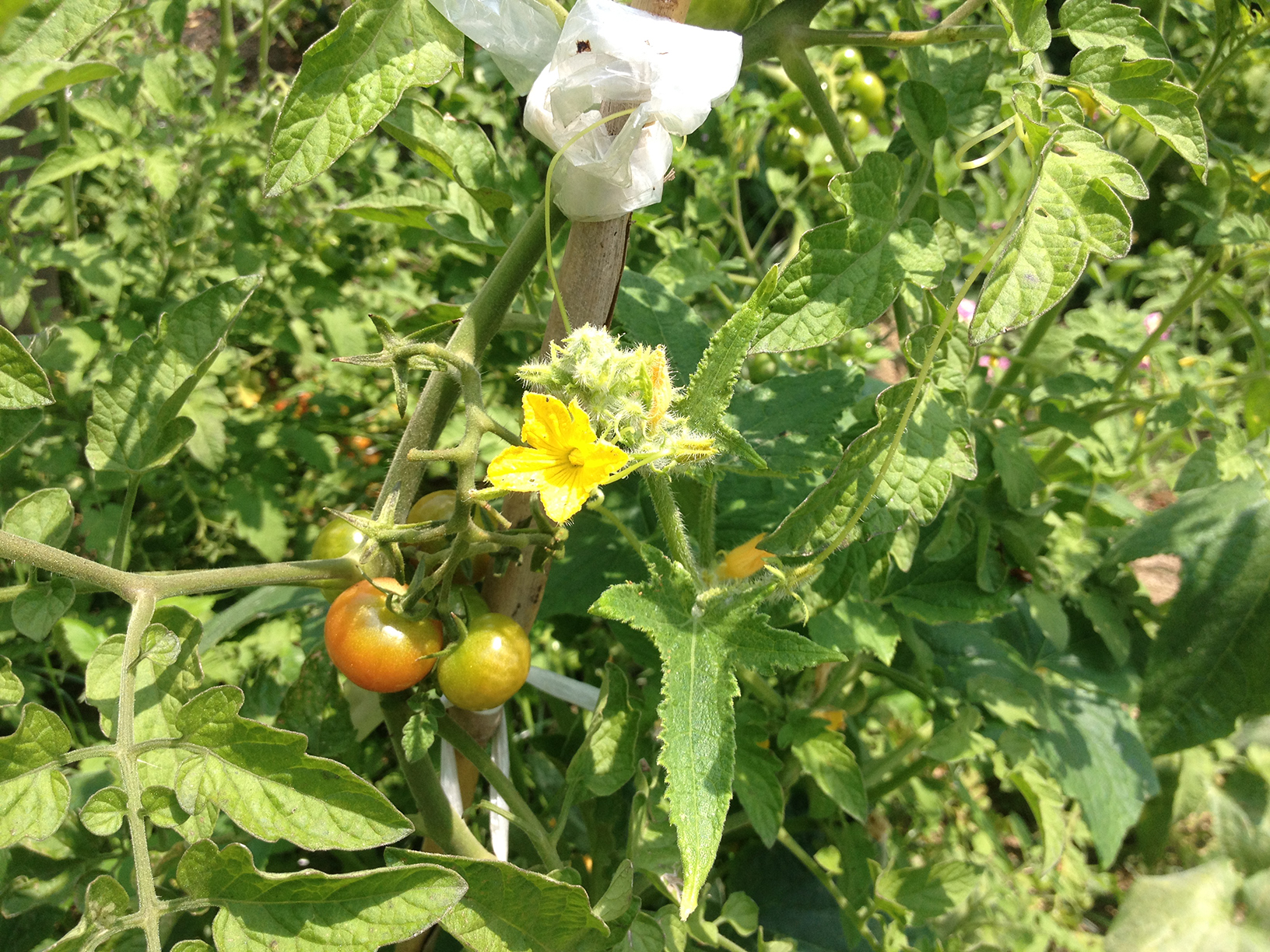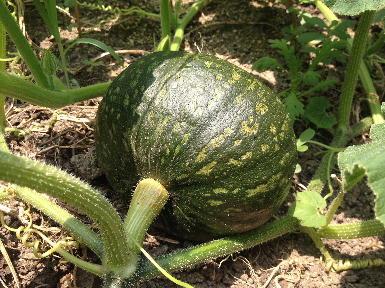 カボチャのツルの裏側を眺めていると、アブラゼミの抜け殻が。。。